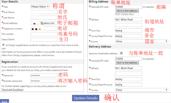 左边表格填写的内容以称谓、姓名、电子邮箱、电话号码、设置密码等个人信息,切记电话号码一定要写对;而右边表格则是需要填写详细的国家、省份、住址、邮编等持卡人收货地址等,值得注意的是由于从英国寄回国内基本都会转寄EMS,所以街道地址用拼音拼写。